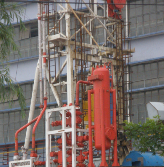 用途;泥漿氣體分離器與節流管匯配套使用,當鉆井過程中出現井涌,井噴時,采取節流壓井措施對井內的含氣泥漿進行替換,泥漿氣體分離器就是用來處理替換出來的含氣泥漿。該裝置由分離器總成,底座總成,液壓控制機構,配套管線,空氣過濾減壓閥,氣動碟閥,二位五通換向閥,安全閥,壓力表等零部件組成。